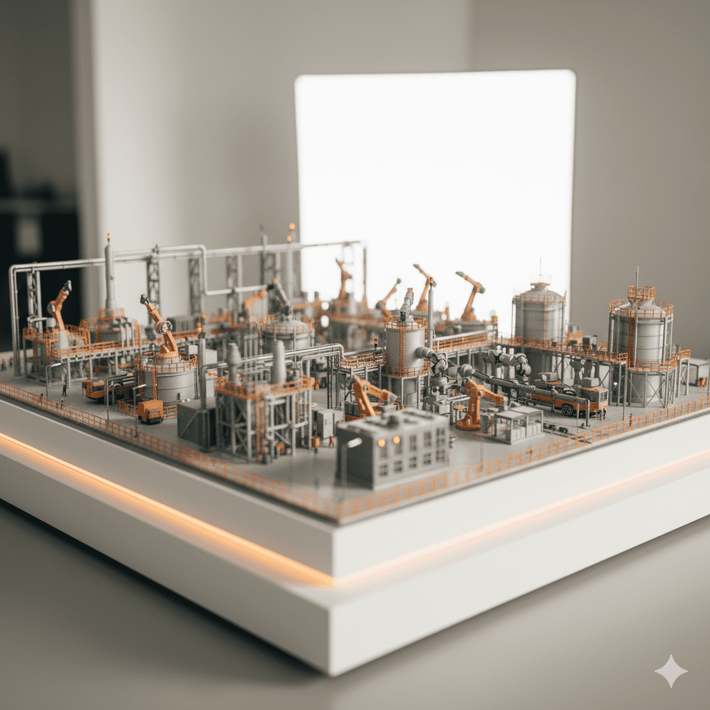 Realistic scale models of factories and plants.